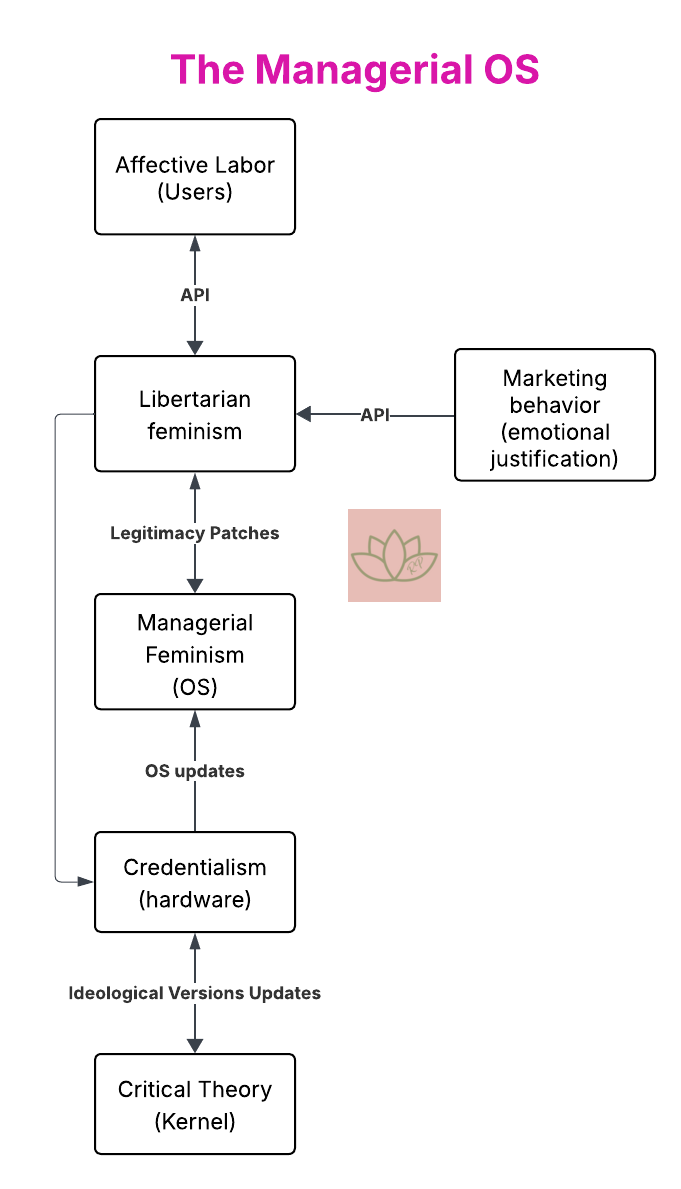 But on top of it I would collapse managerial and libertarian feminism just down into “Schrodinger’s feminism”. Basically, at the hardware level, feminism means whatever you want to mean. It sits on top of critical theory because it allows feminist to simultaneously be empowered while embodying victimhood.